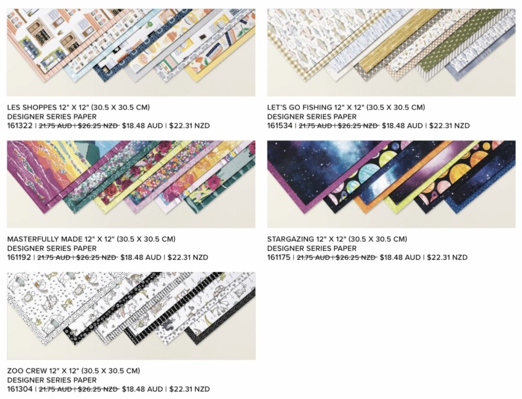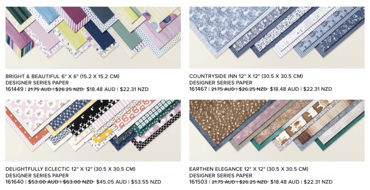 Thirteen (13) packets are included in the sale: Twelve (12) packets of patterned paper from the Annual Catalogue and one Online Exclusive packet are 15% off. What better time to stock up and save!